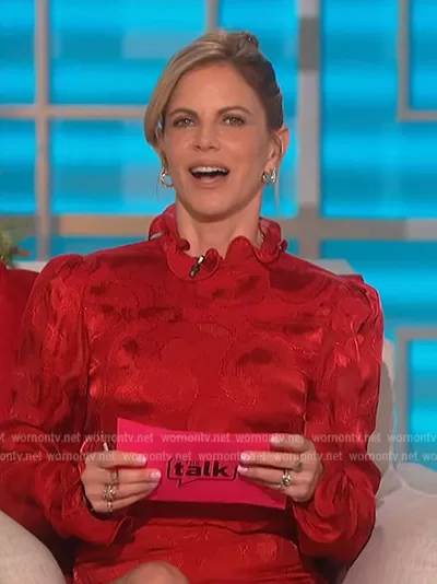 Natalie Morales on The Talk on CBS was spotted wearing this red ruffle neck mini dress on The Talk on Dec 01 2022's episode. Natalie's Dress is the Rina-B Dress by Saloni.