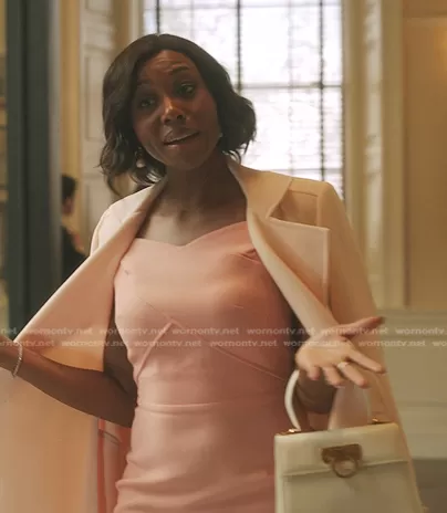 Camille de Haan (played by Amanda Warren) on Gossip Girl on HBO Max was spotted wearing this pink dress on Gossip Girl on episode 'One Flew Over the Cucks's Nest' (2x04) in Dec 2022. 's Dress is the Amarula Off-The-Shoulder Dress by Roland Mouret . 's Bag is the Iconic Top Handle Bag by Ferragamo.