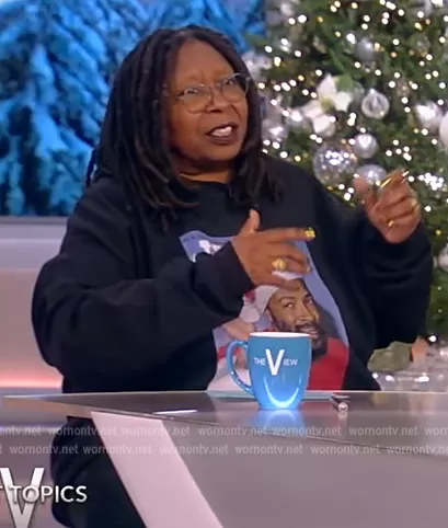 Whoopi Goldberg on The View on ABC was spotted wearing this Marvin Gaye Santa print sweatshirt on The View on Dec 16 2022's episode. Whoopi's Sweater is the Marvin Gaye Black Santa Claus Sweatshirt by For The People Boutique at Etsy.