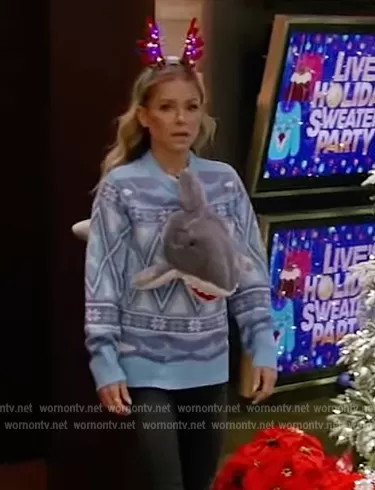 Kelly Ripa on Live with Kelly and Mark on Disney ABC Home Entertainment was spotted wearing this blue 3d shark Christmas sweater on Live with Kelly and Ryan on Dec 17 2022's episode. Kelly's Sweater is the 3D Shark Plushie Ugly Christmas Sweater by Ugly Christmas Sweater.