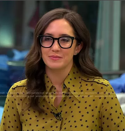 Savannah Sellers on Today on NBC was spotted wearing this yellow star print blouse on Today on Dec 19 2022's episode. Savannah S's Top is the Star Print Silk Shirt by Mos Mosh.