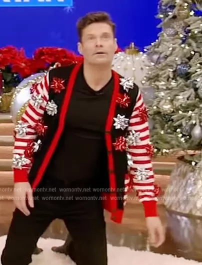 on Live with Kelly and Mark on Disney ABC Home Entertainment was spotted wearing this bow embellished Christmas sweater on Live with Kelly and Ryan on Dec 19 2022's episode. 's Sweater is the Wrapping Bow Cardigan by Ugly Christmas Sweater.