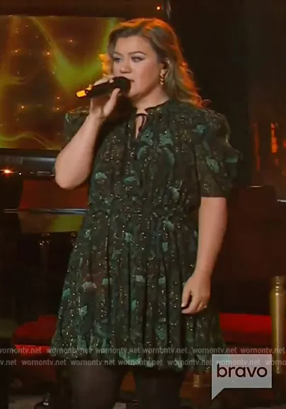 Kelly Clarkson on The Kelly Clarkson Show on NBC was spotted wearing this green metallic floral dress on The Kelly Clarkson Show on Dec 19 2022's episode. Kelly's Dress is the Ada Dress by Ulla Johnson.