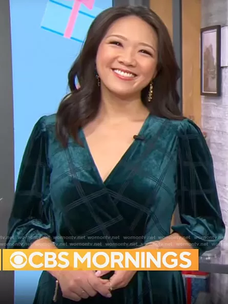 Nancy Chen on CBS Mornings on CBS was spotted wearing this green velvet wrap dress on CBS Mornings on Dec 20 2022's episode. Nancy's Dress is the Velvet Faux Wrap Dress by Calvin Klein .