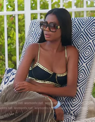 Kiki Barth (played by Kiki Barth) on The Real Housewives of Miami on Peacock was spotted wearing this black studded trim bikini on The Real Housewives of Miami on episode 'Destination: Divorce' (5x05) in Dec 2022. Kiki's Top is the Stud Underwire Bikini Top by Norma Kamali.