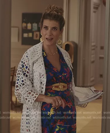 (played by Kate Walsh) on Emily in Paris on Netflix was spotted wearing this blue floral print dress on Emily in Paris on episode 'I Have Two Lovers' (3x01) in Dec 2022. 's Dress is the Lando floral-print wrap midi dress by Diane von Furstenberg.
