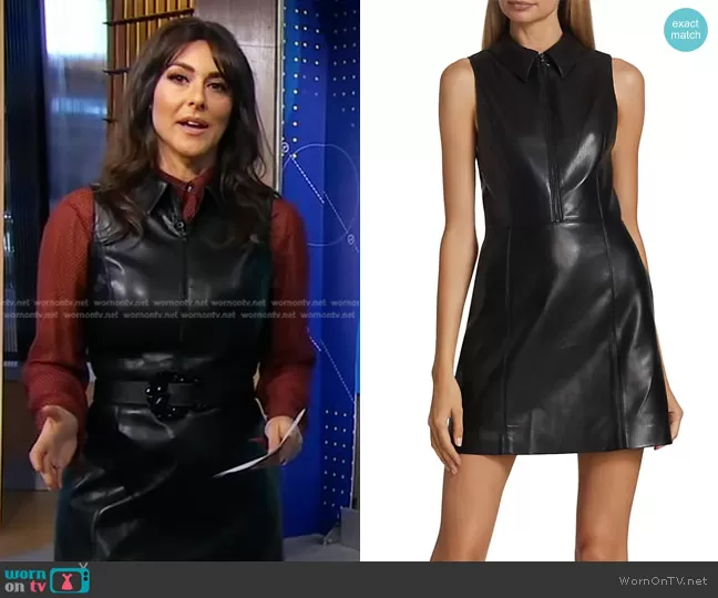 Erielle Reshef on Good Morning America on ABC was spotted wearing this black sleeveless leather dress on Good Morning America on Dec 21 2022's episode. Erielle's Dress is the Ellis Zip-Front Vegan Leather Dress by Alice + Olivia.