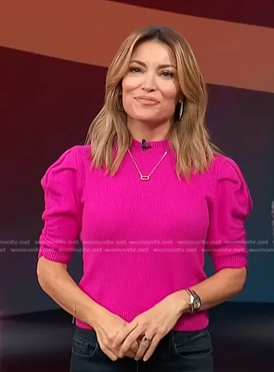 Kit Hoover on Access Hollywood on NBC was spotted wearing this pink puff sleeve sweater on Access Hollywood on Dec 21 2022's episode. Kit's Sweater is the Ruched Sleeve Cashmere-Wool Sweater in Magenta by Frame.