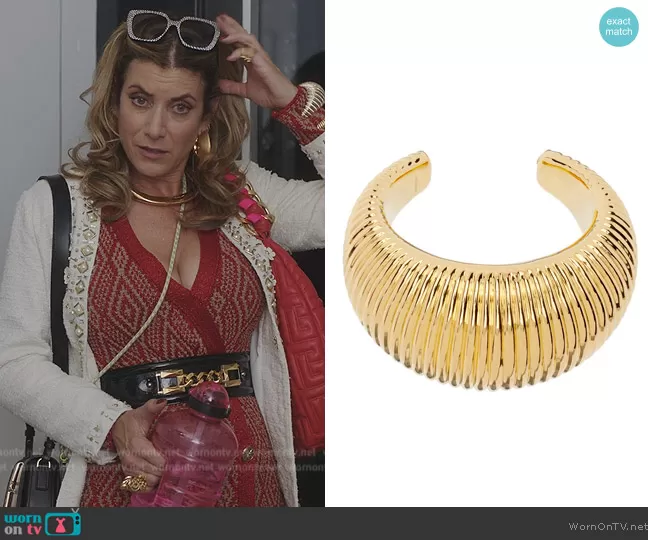 Madeline Wheeler (played by Kate Walsh) on Emily in Paris on Netflix was spotted wearing this studded sunglasses on Emily in Paris on episode 'Coo D'etat' (3x03) in Dec 2022. Madeline's Dress is the Coat Dress with Ethnic Diamond Pattern by Elisabetta Franchi . Madeline's Belt is the Belted patent pencil skirt by Elisabetta Franchi . Madeline's Sunglasses is the Animation 55MM Cat Eye Sunglasses by Celine . Madeline's Bag is the Quilted leather Pillow Hobo bag by Balmain . Madeline's Bag is the Greca Goddess Large Shoulder Bag by Versace . Madeline's Bracelet is the Rhinestone Arpege Bracelet by Lanvin . Madeline's Bracelet is the Arpege Bracelet by Lanvin . Madeline's Waterbottle is the Lifestyle Daily 8 Water Jug by Bluewave .