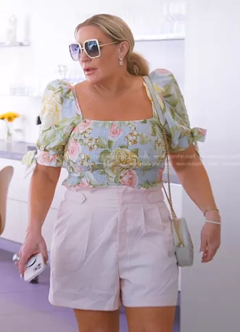 Heather Gay on The Real Housewives of Salt Lake City on Bravo was spotted wearing this floral smocked top on The Real Housewives of Salt Lake City on episode 'White Lies and Black Eyes' (3x12) in Dec 2022. Heather's Top is the Floral Square Neck Smocked Top by Express . Heather's Sunglasses is the Chain 57MM Square Sunglasses by Gucci . Heather's Bag is the Jade Round Matelass Leather Bag by Saint Laurent.