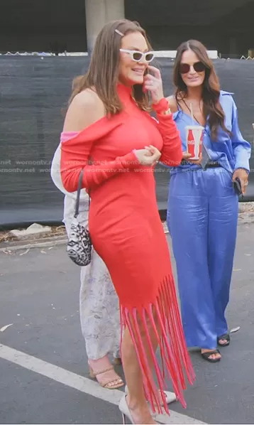 Meredith Marks on The Real Housewives of Salt Lake City on Bravo was spotted wearing this red and pink fringed dress on The Real Housewives of Salt Lake City on episode 'White Lies and Black Eyes' (3x12) in Dec 2022. Meredith's Dress is the Knitted Cotton and Silk Dress by Bottega Veneta . Meredith's Sunglasses is the New Wave 277 Sunglasses by Saint Laurent . Meredith's Bag is the Tufted Monogram Pochette by Louis Vuitton.