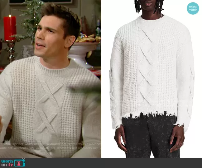 Dr. John Finnegan (played by Tanner Novlan) on The Bold and the Beautiful on CBS was spotted wearing this sweater with crosses on The Bold and the Beautiful on Dec 22 2022's episode. Finn's Sweater is the Hennet Sweater by All Saints.