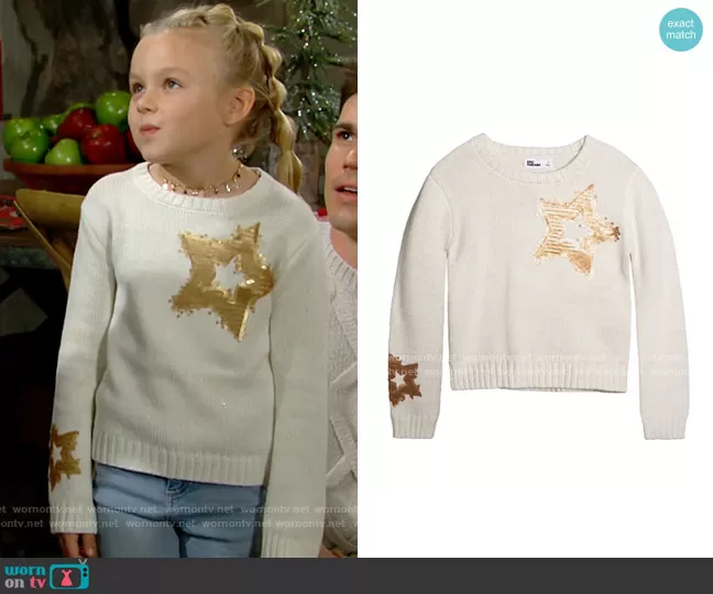 Kelly Spencer (played by Sophia Paras McKinlay) on The Bold and the Beautiful on CBS was spotted wearing this sequin star sweater on The Bold and the Beautiful on Dec 22 2022's episode. 's Sweater is the Long Sleeves Star Sweater by Epic Threads .