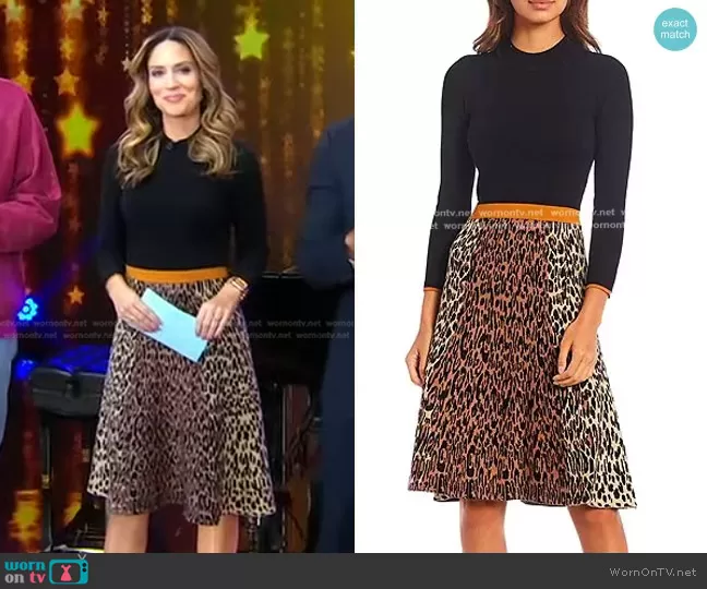 Rhiannon Ally on Good Morning America on ABC was spotted wearing this black leopard dress on Good Morning America on Nov 07 2025's episode. Rhiannon's Dress is the Jacquard Leopard Mock Neck 3/4 Sleeve Knit Bodice Sweater Dress by Eliza J.