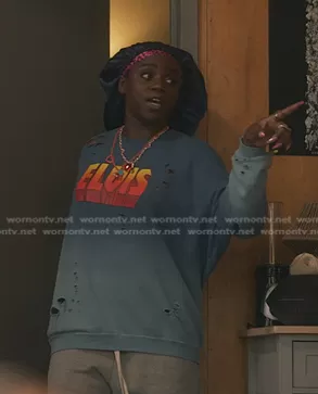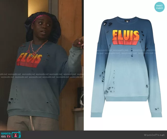 Shan (played by ) on Gossip Girl on HBO Max was spotted wearing this blue Elvis sweatshirt on Gossip Girl on episode 'Games, Trains, and Automobiles' (2x05) in Dec 2022. 's Sweater is the Elvis-Print Distressed-Effect Sweatshirt R13.