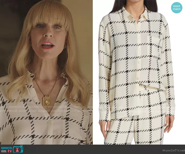 (played by charley fouquet) on Emily in Paris on Netflix was spotted wearing this white check blouse on Emily in Paris on episode 'Ex-en-Provence' (3x06) in Dec 2022. 's Top is the Aspen checked crepe shirt by Anine Bing.