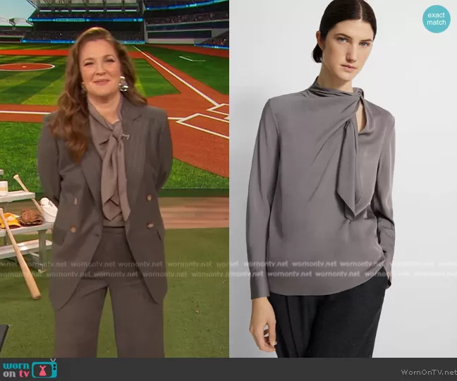 Drew Barrymore on The Drew Barrymore Show on CBS was spotted wearing this gray tie neck blouse on The Drew Barrymore Show on Dec 19 2022's episode. Drew's Top is the Twisted Scarf Blouse in Silk Georgette by Theory . Drew's Blazer is the Wool Blend Double-Breasted Pinstripe Jacket by Brooks Brothers.