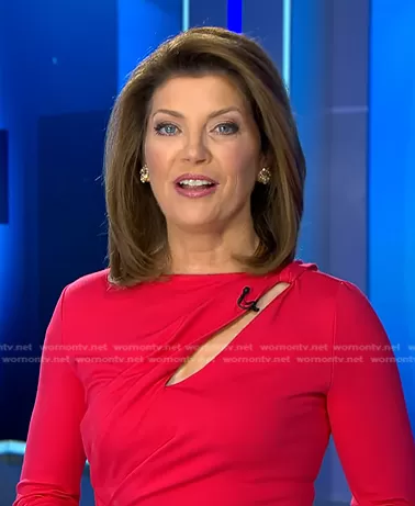 Norah O'Donnell on CBS Evening News on CBS was spotted wearing this red cutout dress and striped pumps on CBS Evening News on Jan 12 2024's episode. Norah's Dress is the Gathered Cut Out Midi-Dress by Giorgio Armani . Norah's Shoes is the Patent Cinestripes Pigalle Follies Pumps in Multi by Christian Louboutin.