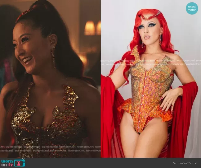Mindy Chen (played by Ashley Park) on Emily in Paris on Netflix was spotted wearing this crystal corset on Emily in Paris on episode 'Love Is in the Air' (3x09) in Dec 2022. Mindy's Corset is the Spring Summer 2022 Collection by ASQUIN .