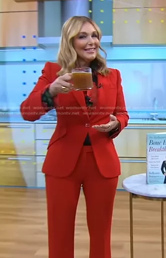 on Good Morning America on ABC was spotted wearing this red blazer on Good Morning America on Dec 26 2022's episode. 's Jacket is the Single-Breasted Crepe Blazer by Alexander McQueen . 's Jacket is the Mid-Rise Flared Pants by Alexander McQueen.