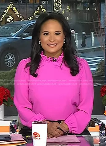 Kristen Welker on Today on NBC was spotted wearing this pink ruffle neck top on Today on Dec 26 2022's episode. Kristen's Top is the Long-Sleeve Ruffle-Neck Top in 365 crepe by J. Crew.