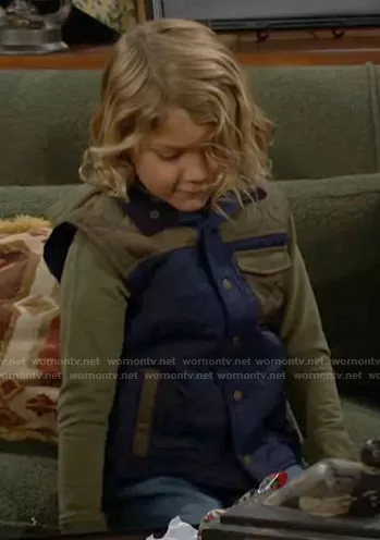 Harrison Locke (played by Kellen Enriquez) on The Young and the Restless on CBS was spotted wearing this blue and green vest on The Young and the Restless on Dec 26 2022's episode. 's Vest is the Colorblocked Quilted Puffer Vest by Janie and Jack.