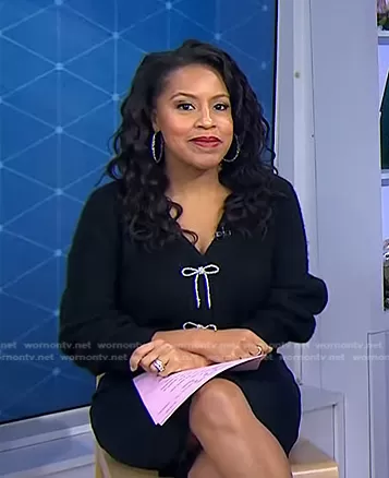 Sheinelle Jones on Today on NBC was spotted wearing this black bow embellished cardigan on Today on Dec 30 2025's episode. Sheinelle's Sweater is the Rhinestone-Bow Rib-Knit Cardigan by H&M.