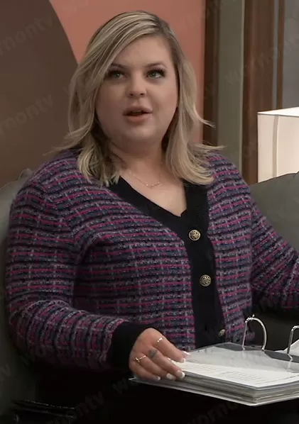 Maxie Jones (played by Kirsten Storms) on General Hospital on ABC was spotted wearing this pink tweed cardigan on General Hospital on Mar 02 2023's episode. Maxie's Sweater is the Tweed Contrast Trim Cashmere Cardigan by C by Bloomingdales.