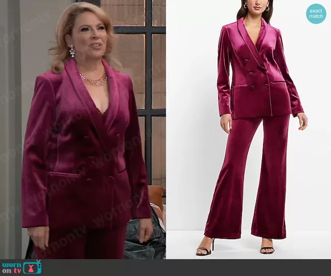 Liesl Obrecht (played by Kathleen Gati) on General Hospital on ABC was spotted wearing this pink velvet suit on General Hospital on Dec 29 2022's episode. Liesl's Jacket is the Velvet Double Breasted Shawl Collar Blazer in Plum by Express . Liesl's Pants is the Editor Super High Waisted Velvet Pants in Plum by Express . Liesl's Earrings is the Fanfare Earrings by Eye Candy LA . Liesl's Necklace is the Gold-Tone Ombré Crystal Statement Necklace by INC International Concepts.