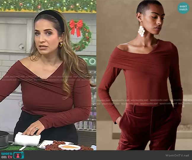 on Today on NBC was spotted wearing this brown asymmetric top on Today on Dec 30 2022's episode. 's Top is the Rayon Off-Shoulder Top by Banana Republic.