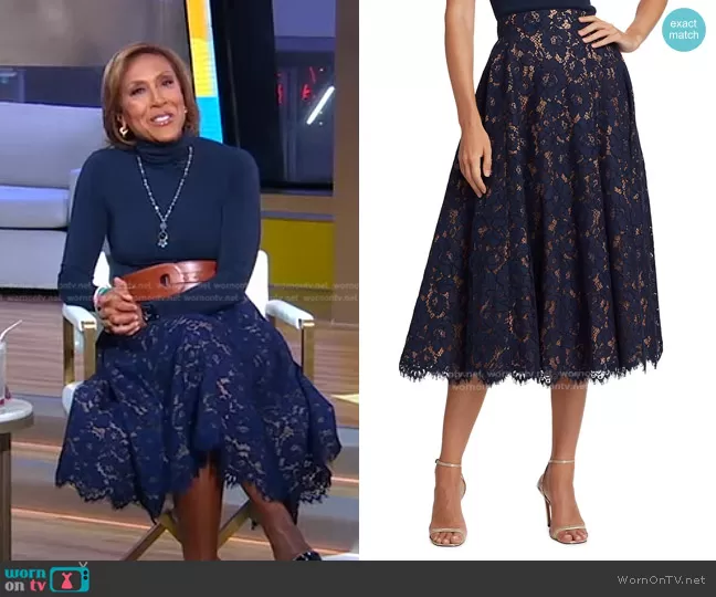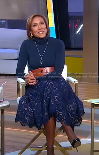 Robin Roberts on Good Morning America on ABC was spotted wearing this navy lace skirt on Good Morning America on Jan 02 2023's episode. Robin's Skirt is the Floral Lace Circle Skirt by Michael Kors Collection.