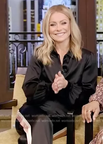 Kelly Ripa on Live with Kelly and Mark on Disney ABC Home Entertainment was spotted wearing this black side stripe pants on Live with Kelly and Ryan on Jan 02 2023's episode. Kelly's Pants is the High-Waisted Satin Trousers by Lanvin.