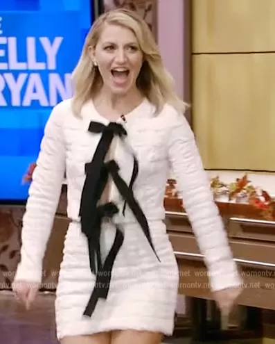 on Live with Kelly and Mark on Disney ABC Home Entertainment was spotted wearing this white textured contrast bow jacket on Live with Kelly and Ryan on Jan 02 2023's episode. 's Jacket is the Quilted Jacket by Oscar de la Renta . 's Skirt is the High-rise miniskirt by Oscar de la Renta.