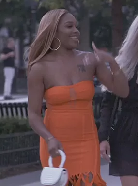 on The Real Housewives of Potomac on Bravo was spotted wearing this Orange strapless fringe dress on The Real Housewives of Potomac on episode 'Mic Drop' (7x12) in Jan 2023. 's Dress is the Fringe The Feeling Bandage Mini Dress by Fashion Nova.