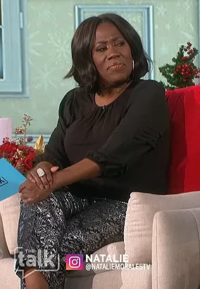 Sheryl Underwood on The Talk on CBS was spotted wearing this metallic jacquard pants on The Talk on Dec 24 2022's episode. Sheryl's Pants is the Metallic Jacquard Straight Leg Pants by Talbots.