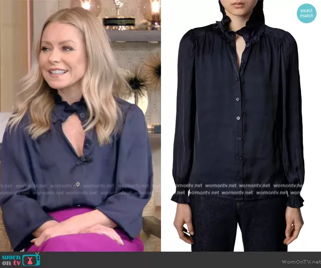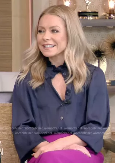 Kelly Ripa on Live with Kelly and Mark on Disney ABC Home Entertainment was spotted wearing this black ruffle neck blouse on Live with Kelly and Ryan on Jan 03 2023's episode. Kelly's Top is the Tacca Satin Ruffle Button-Up Blouse by Zadig & Voltaire . Kelly's Skirt is the Salway Skirt by Roland Mouret . Kelly's Shoes is the Mirror Calfskin Stiletto Pumps by Gianvito Rossi.