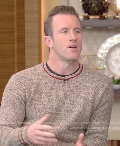 on Live with Kelly and Mark on Disney ABC Home Entertainment was spotted wearing this stripe trim sweater on Live with Kelly and Ryan on Jan 03 2023's episode. 's Sweater is the Marled Wool-Cotton Crewneck Sweater by Ralph Lauren.