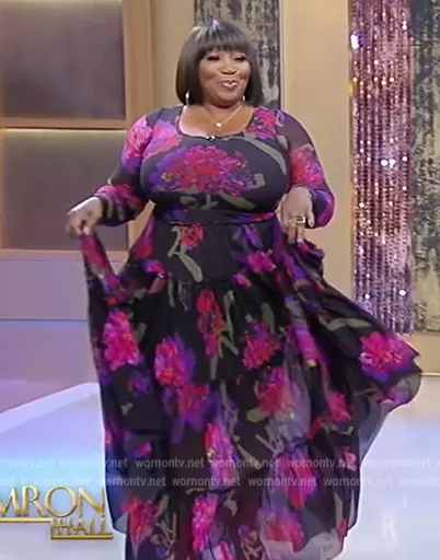 on Tamron Hall Show on ABC was spotted wearing this black floral print maxi dress on Tamron Hall Show on Jan 03 2023's episode. 's Dress is the Floral Tulle Tiered Maxi Dress by Prabal Gurung.