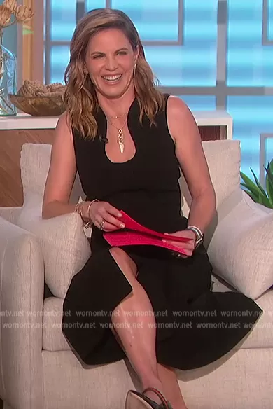 Natalie Morales on The Talk on CBS was spotted wearing this black scoop neck dress on The Talk on Jan 03 2023's episode. Natalie's Dress is the Keyhole Neck Crepe Midi Dress by Victoria Beckham.