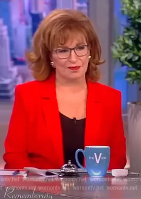 Joy Behar on The View on ABC was spotted wearing this red blazer on The View on Jul 10 2024's episode. Joy's Blazer is the Khloe Crepe 3/4-Sleeve Blazer by Cinq a Sept.