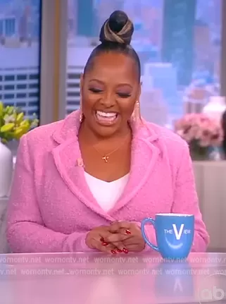 on The View on ABC was spotted wearing this pink textured double breasted mini dress on The View on Jan 03 2023's episode. 's Dress is the + NET SUSTAIN Newton double-breasted recycled-boucle mini dress by Rotate Birger Christensen.