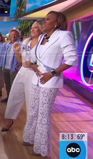 Robin Roberts on Good Morning America on ABC was spotted wearing this white blazer and lace pants on Good Morning America on Aug 30 2023's episode. Robin's Jacket is the Crushed Sleeve Blazer by Michael Kors Collection . Robin's Pants is the Lace High-Waisted Flared Pants by Michael Kors Collection.