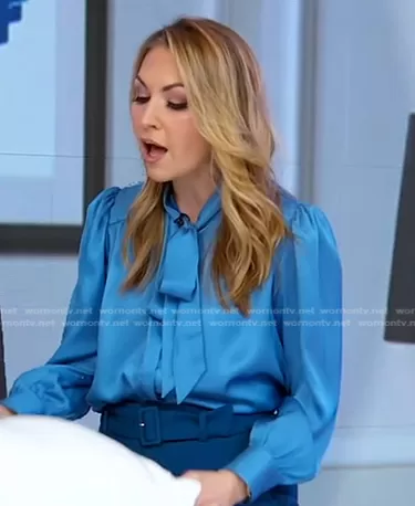 Lori Bergamotto on Good Morning America on ABC was spotted wearing this blue tie neck blouse on Good Morning America on Dec 27 2024's episode. Lori's Top is the Bow Tie Blouse in Marina Blue by Ann Taylor . Lori's Pants is the The High Waist Belted Boot Cut Pant in Lavish Blue by Ann Taylor.