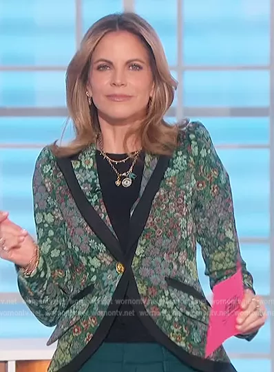 Natalie Morales on The Talk on CBS was spotted wearing this green floral embroidered blazer on The Talk on Jan 04 2023's episode. Natalie's Blazer is the Pouf-Sleeve Floral Jacquard Blazer by Smythe.