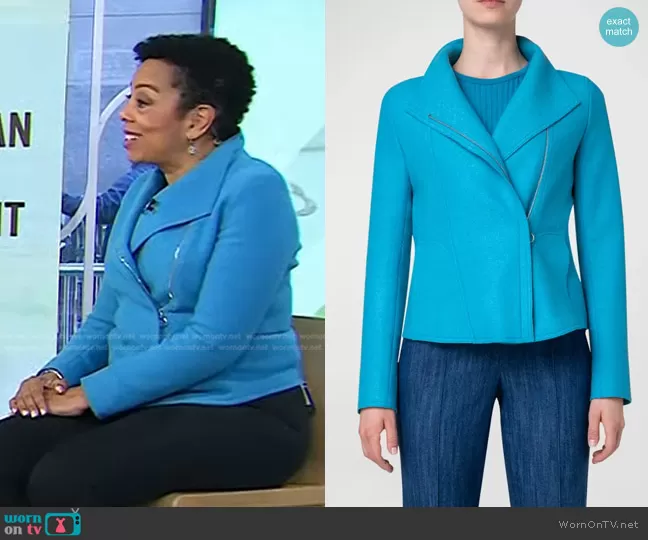 on Today on NBC was spotted wearing this blue wool moto jacket on Today on Jan 04 2023's episode. 's Jacket is the Fitted Wool Biker Jacket by Akris Punto.
