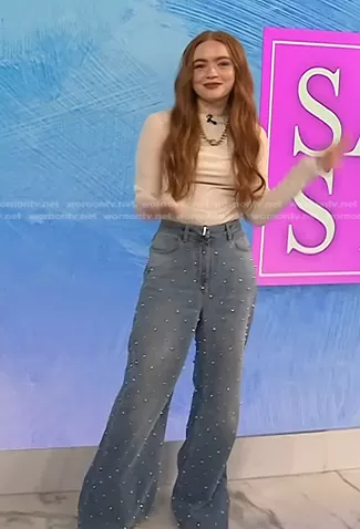 on Today on NBC was spotted wearing this white cutout top and pearl embellished jeans on Today on Jan 04 2023's episode. 's Top is the Graphic Cut-out Long-sleeved Top by Ginvenchy . 's Pants is the High-Rise Stretch Pearl Wide-Leg Jeans by Ginvenchy.