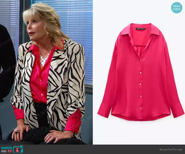 Bonnie Lockhart (played by Judi Evans) on Days of our Lives on Peacock was spotted wearing this pink blouse and zebra print jacket on Days of our Lives on Jan 06 2023's episode. Bonnie's Top is the Satin Effect Shirt in Fuchsia by Zara . Bonnie's Jacket is the Blazer with Rolled-Up Sleeves by Zara.