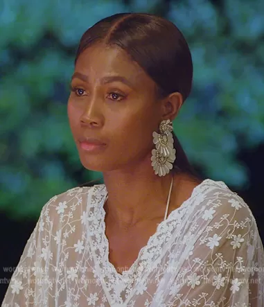 Kiki Barth (played by Kiki Barth) on The Real Housewives of Miami on Peacock was spotted wearing this floral embellished statement earrings on The Real Housewives of Miami on episode 'Stars and Cigars' (5x07) in Jan 2023. Kiki's Earrings is the Natalie Statement Earring- Disco by Buddy Love.