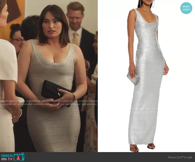 Heidi Bergmann (played by Kathryn Gallagher) on Gossip Girl on HBO Max was spotted wearing this metallic scoop neck maxi dress on Gossip Girl on episode 'Dress Me Up! Dress Me Down' (2x07) in Jan 2023. 's Dress is the Metallic Coated Bandage Gown by Herve Leger.