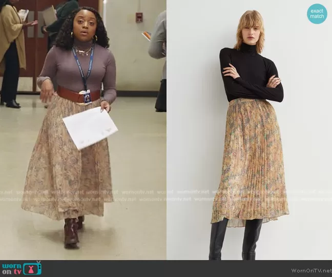 Janine Teagues (played by Quinta Brunson) on Abbott Elementary on ABC was spotted wearing this floral pleated skirt on Abbott Elementary on episode 'Read-A-Thon' (2x11) in Jan 2023. Janine's Skirt is the Pleat Skirt by H&M.